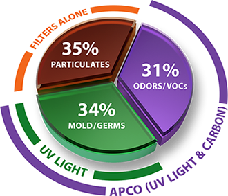Conventional filtration is effective against particulates, like dust, but has no effect on the other two thirds. Fresh-Aire UV light products, such as Blue-Tube UV, are proven to sterilize biological contaminants like mold, germs, and viruses in the air and on air system surfaces. Our award-winning APCO products neutralize odour-causing VOCs as well as biological contaminants inside the air system and throughout the home.